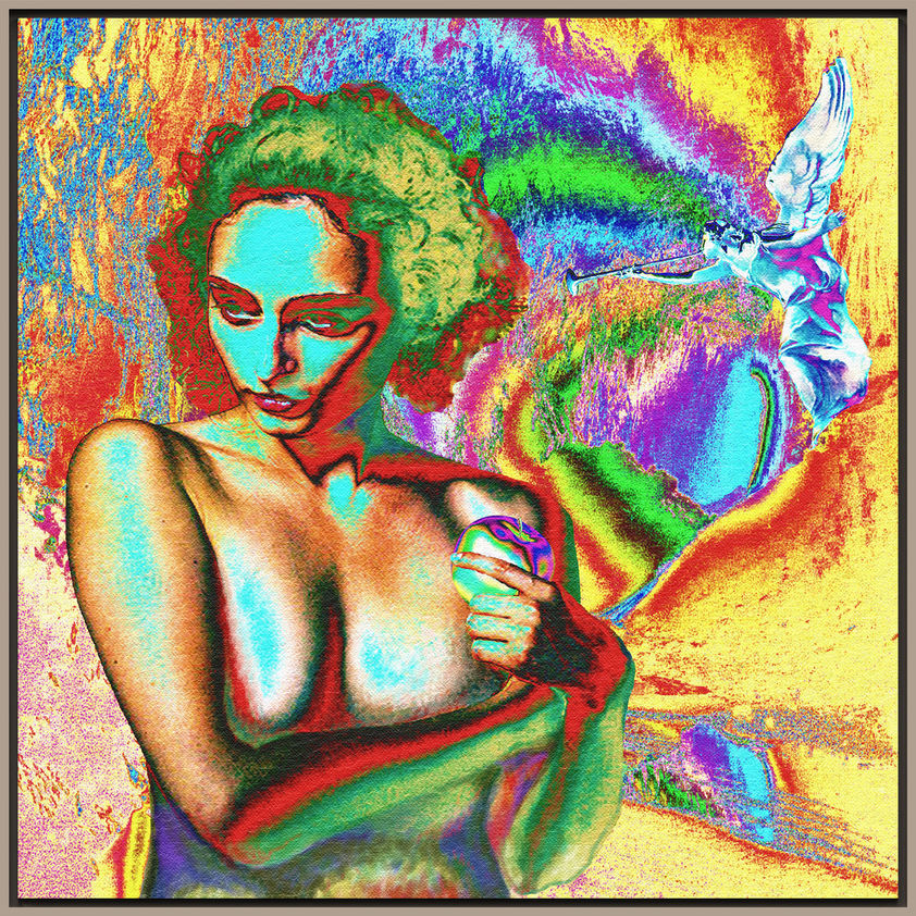 - Artwork 50 x 50 cm, Stretched and framed in zero gap floater 52 x 52 x 4.3 cm no Rebate. Natura wood color.