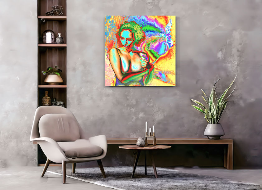 - Artwork stretched on stretching wooden frame measuring 50 by 50 by 2.5 cm