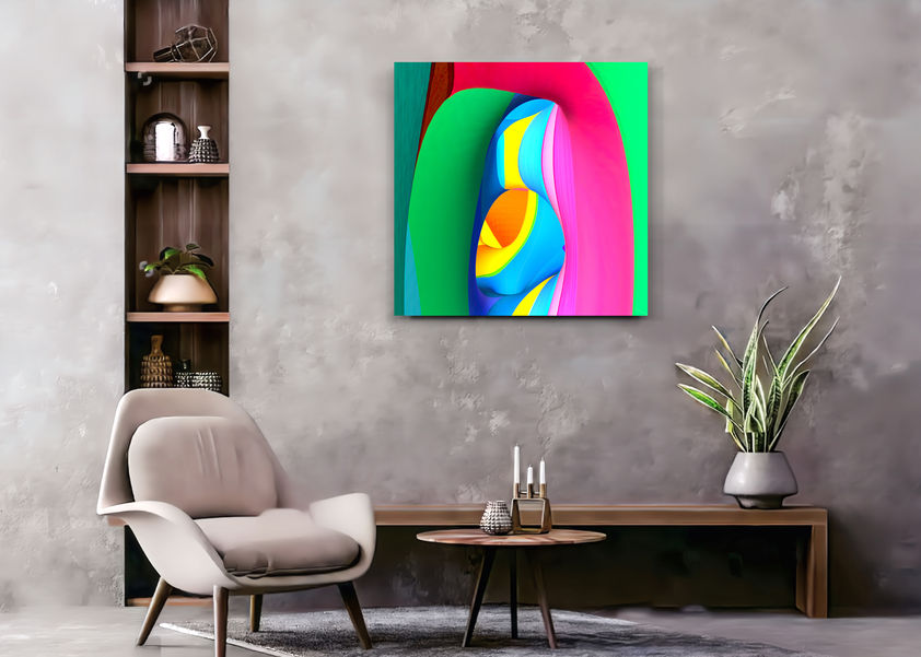- Artwork 50 x 50 cm, Stretched and framed in zero gap floater 52 x 52 x 4.3 cm no Rebate. Natura wood color.